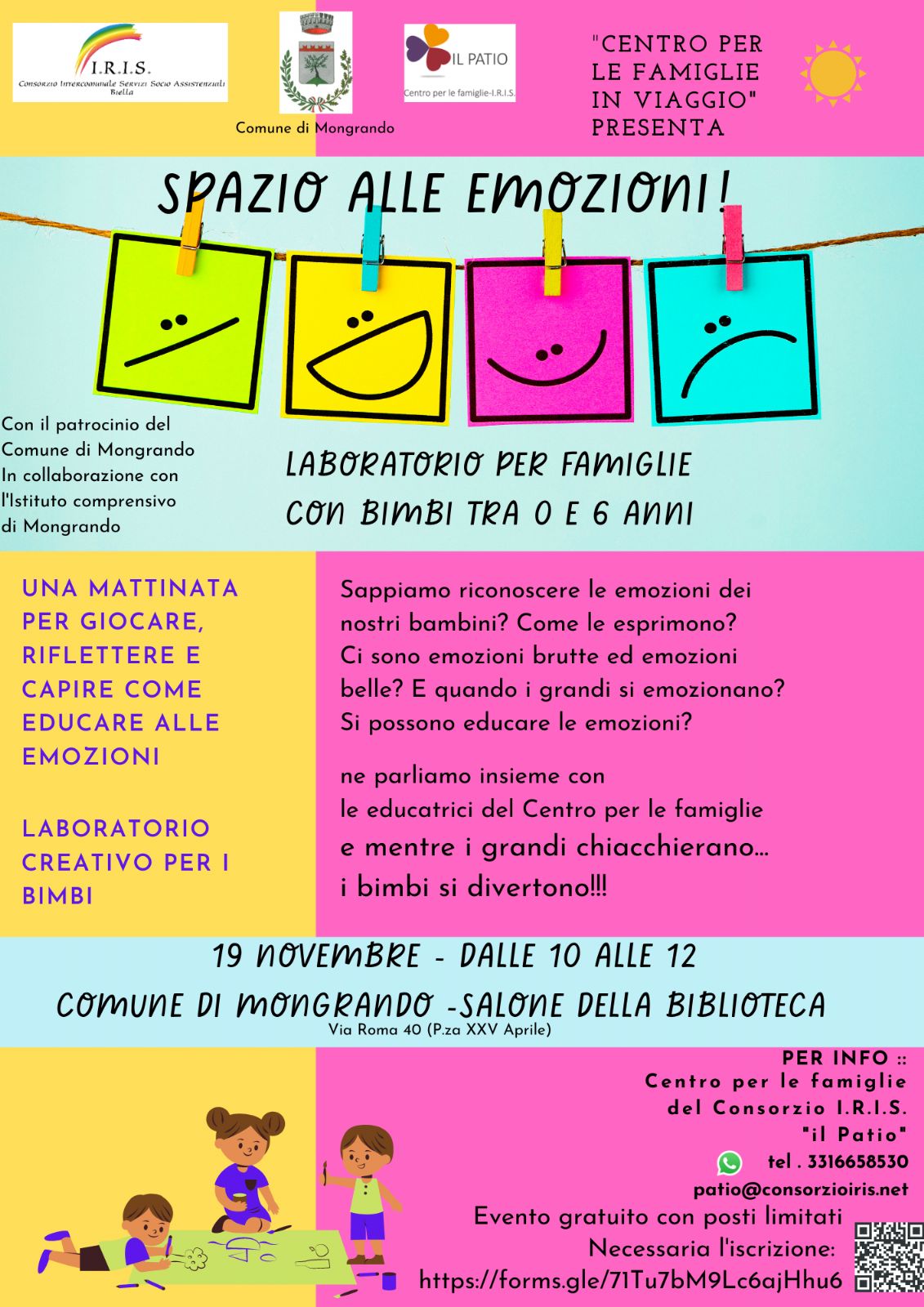 il Centro per le famiglie del Consorzio I.R.I.S. "Il Patio" , in collaborazione con il Comune di Mongrando e l'Istituto Comprensivo di Mongrando, sta organizzando una mattinata di laboratorio/incontro per famiglie con bambini e bambine tra 0 e 6 anni.
