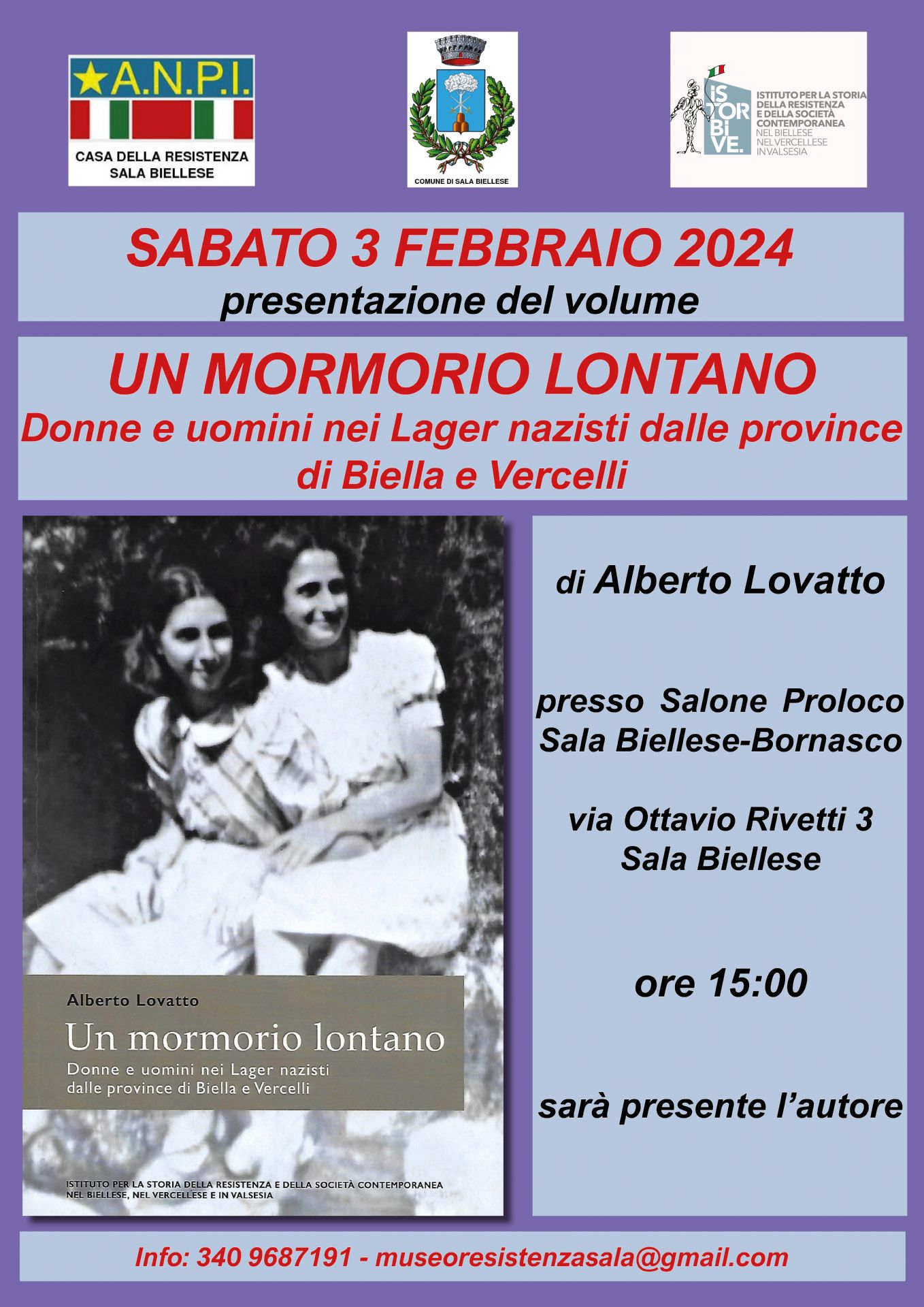 Sabato 3 febbraio 2024, ore 15:00, presso il Salone della Proloco Sala Biellese e Bornasco (via Ottavio Rivetti, 3) : presentazione del volume di Alberto Lovatto "Un mormorio lontano. Donne e uomini nei Lager nazisti dalle province di Biella e Vercelli" (2023). Con il trascorrere del tempo la storia dei deportati rischia di diventare un mormorio lontano non più udibile e comprensibile. Questo libro cerca di ridare voce a quelle tragiche pagine della Storia raccontando la deportazione delle donne e degli uomini delle province di Biella e Vercelli, microcosmo esperienziale e territoriale nella vastità della storia dello sterminio. L’autore ricompone in un disegno unitario i tasselli di una documentazione, d’archivio e storiografica, altrimenti dispersa e frammentaria, osservandola attraverso la memoria privata e intima che emerge dalle testimonianze orali, dai diari e dai rari scambi epistolari.