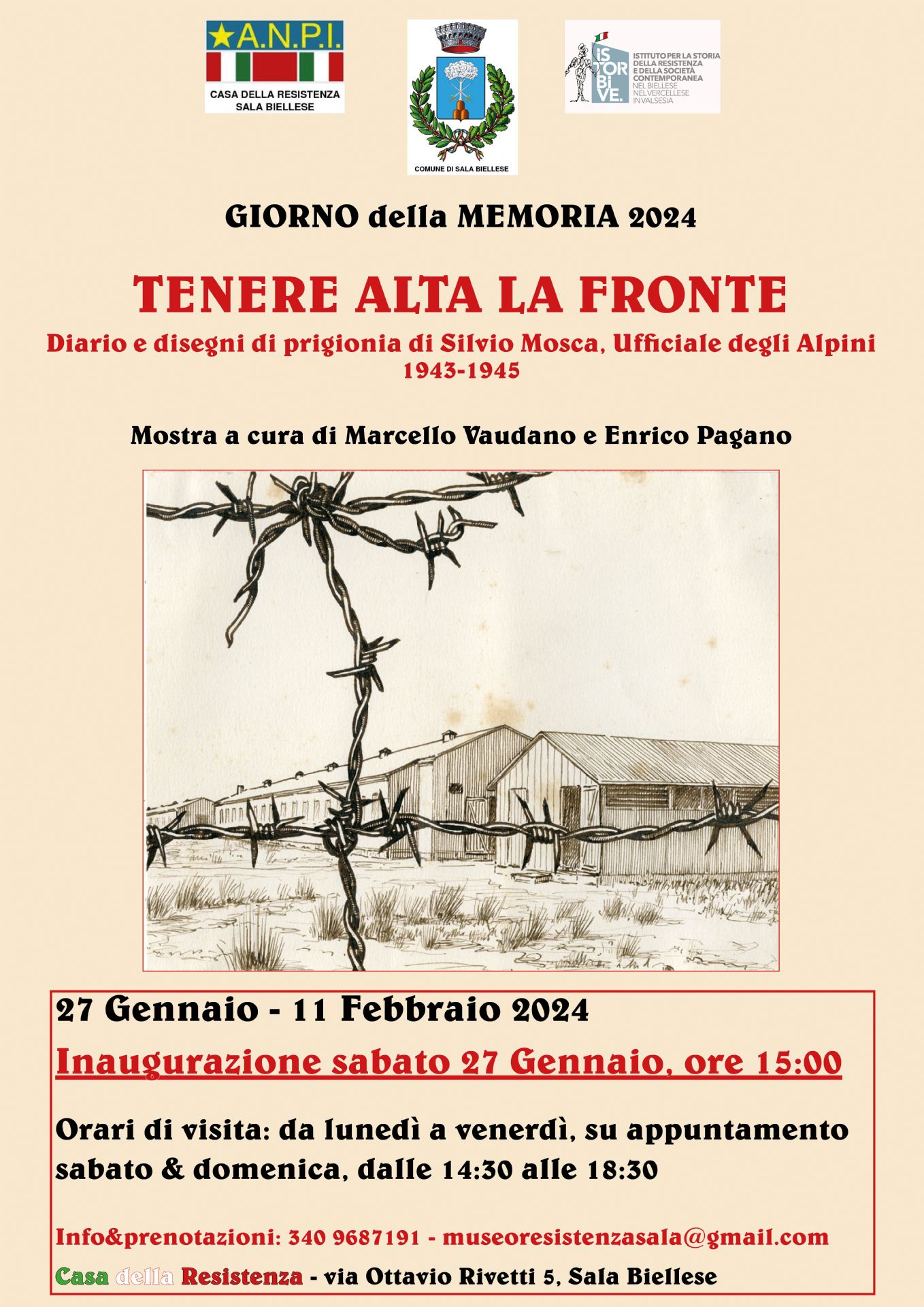 Sabato 27 gennaio 2024, ore 15:00, presso i locali della Casa della Resistenza: presentazione della mostra "Tenere alta la fronte. Diario e disegni di prigionia di Silvio Mosca, Ufficiale degli Alpini 1943-1945". Curata da Marcello Vaudano ed Enrico Pagano, è tratta dall’omonimo volume, che propone l’esperienza dell’internamento militare di Silvio Mosca, giovane industriale biellese, nei campi di prigionia della Germania di Hitler durante la seconda guerra mondiale.